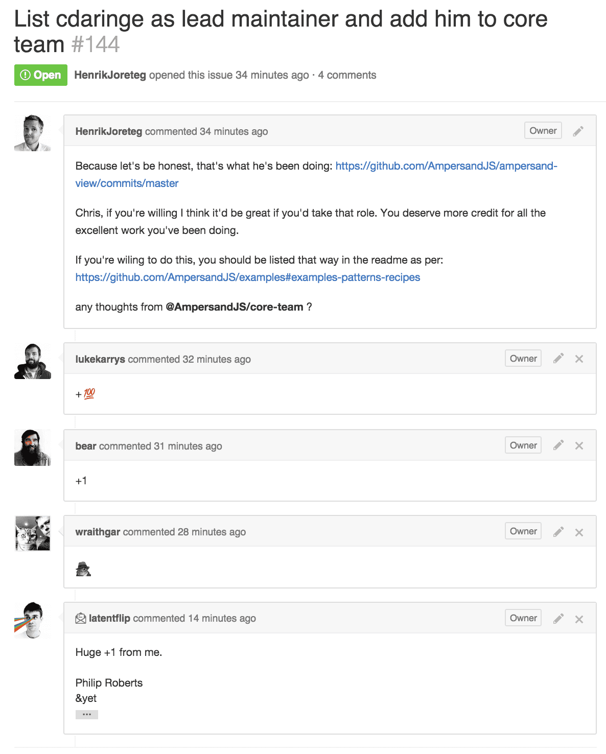 I've been a regular contributor to AmpersandJS for the better part of the last year. I put most of my hours into improving the FormView and FormFieldView set of packages. I've landed other patches and features in the &-ecosystem too, but dialing in the form interface was key for me. It was a lot fun, mainly due to that fact that the &-yet crew is a smart, positive, fun-to-work-with group! Today is a big day! :) Glad to join the team.
